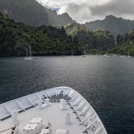 This island, which saw the construction of the first airstrip in the Marquesas in 1972, is largely arid and home to many wild horses, goats and pigs. In the early morning, the Aranui will perform an impressive maneuver, a 180 degree turn in the magnificent "Invisible Bay" of Vaipaee. A maneuver that requires all the dexterity of the captain and crew is not to be missed. On the dry land of Ua Huka, visit the small museum with exquisite replicas of Marquesan art where our guides will immerse you in this ancient civilization. Continue in your 4×4 to explore the island, stopping for breathtaking views, visit the arboretum born of the passion of the island’s former mayor, before reaching the beautiful village of Hane. Lunch will be served at a local family restaurant. Discover some of the island’s specialties, handicrafts, wood carvings, and engraved coconut shells. After lunch, return to the boat by 4×4. For the more spirited, a 2 mile walk back from the tree house awaits you. Be sure to be on deck as the Aranui will sail all along the coast of Ua Huka for more great views.